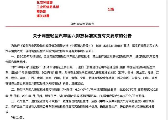 5月15日,據(jù)生態(tài)環(huán)境部網(wǎng)站消息,生態(tài)環(huán)境部等四部門聯(lián)合發(fā)布關(guān)于調(diào)整輕型汽車國(guó)六排放標(biāo)準(zhǔn)實(shí)施有關(guān)要求的公告,自2020年7月1日起,全國(guó)范圍實(shí)施輕型汽車國(guó)六排放標(biāo)準(zhǔn),禁止生產(chǎn)國(guó)五排放標(biāo)準(zhǔn)輕型汽車,進(jìn)口輕型汽車應(yīng)符合國(guó)六排放標(biāo)準(zhǔn)。